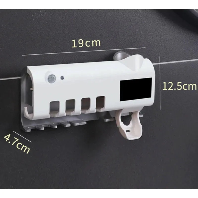 toothbrush holder holds 8 cucumbers which are suitable for family use. The front row of the toothbrush disinfector holds 4 toothbrushes and the second row holds 1 dental floss, 1 razor and 1 tongue scraper. The design of the toothpaste dispenser is also well humanized, you can place any kind of toothpaste because we provide you with a multi-function adapter.